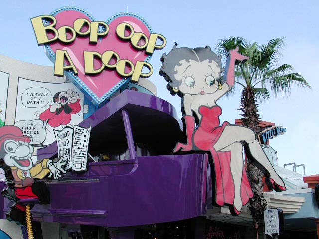 何はさておいてスパスダーマンのATに向かう。 なんとすでに30分待ち。周辺の写真を撮ったり、ショップを覗き、戻ってくると75分待ち。アメリカでもスパスダーマンは超人気らしい。これだけ待つのは無理なので今日はあきらめ、明日、早く来て楽しむことに決める。 ベティやブロンディそしてポパイ等々コミックの主役のショップがずらり。これまた覗いて写真を撮る。