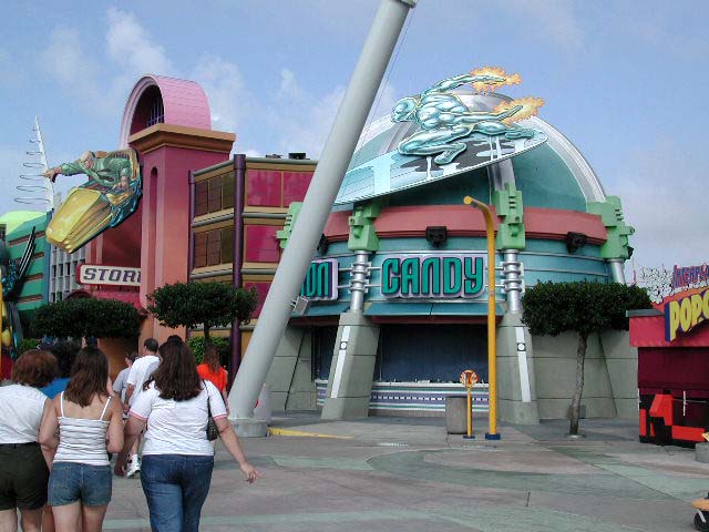 何はさておいてスパスダーマンのATに向かう。 なんとすでに30分待ち。周辺の写真を撮ったり、ショップを覗き、戻ってくると75分待ち。アメリカでもスパスダーマンは超人気らしい。これだけ待つのは無理なので今日はあきらめ、明日、早く来て楽しむことに決める。 ベティやブロンディそしてポパイ等々コミックの主役のショップがずらり。これまた覗いて写真を撮る。